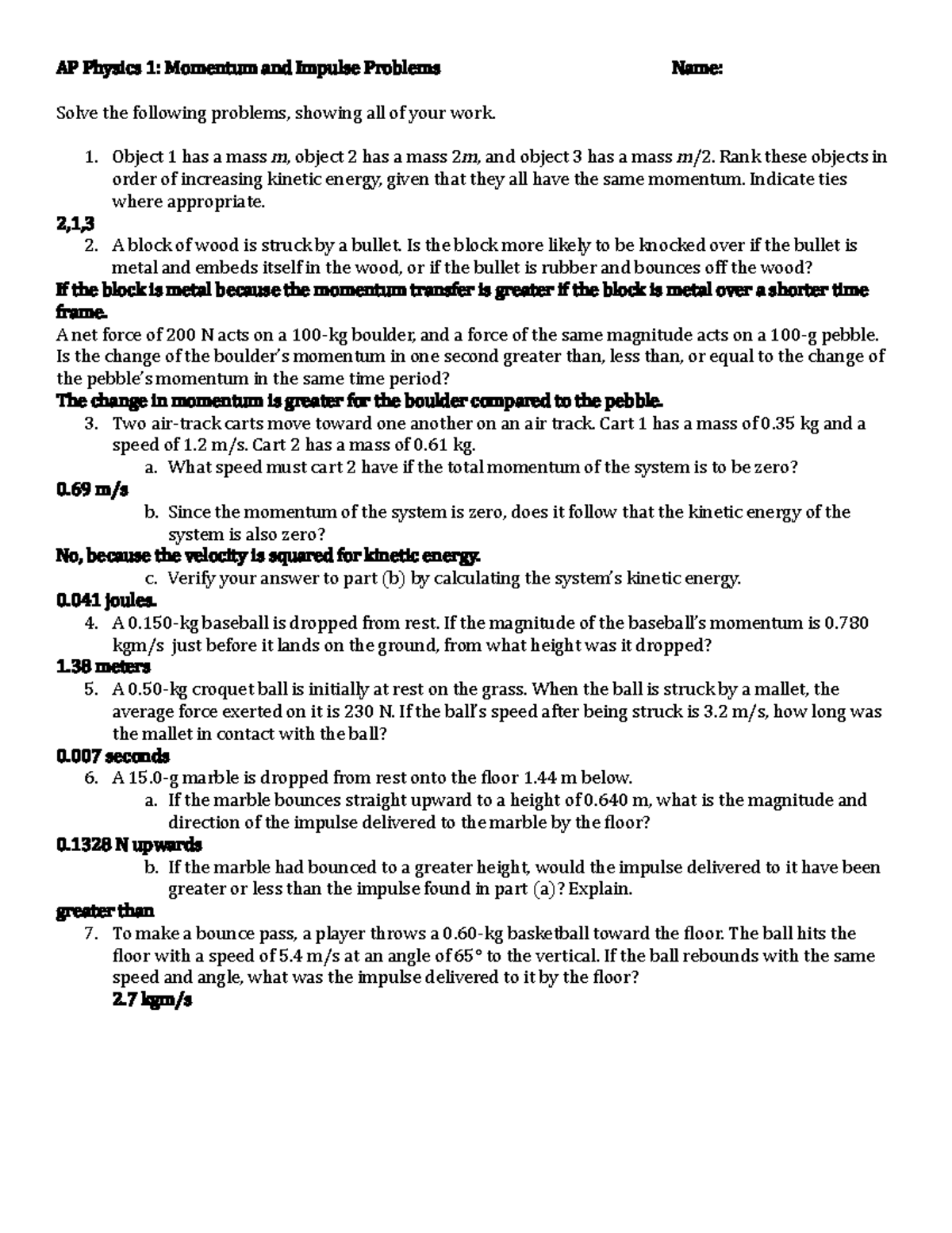 AP 1 Momentum Problems 2 - Name ...