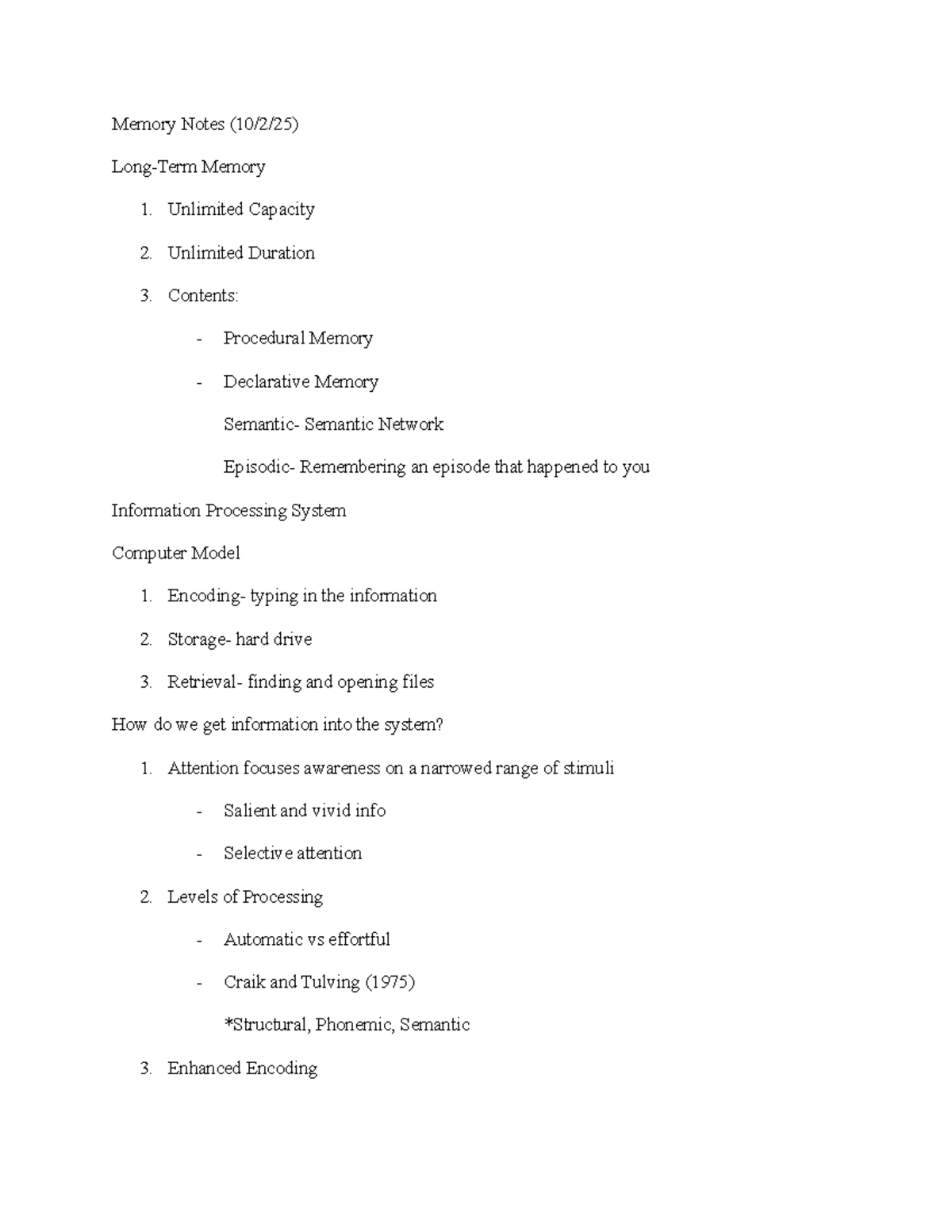 Memory Notes - Unit 2: Understanding Memory Processes and Retrieval ...
