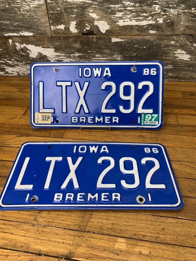 Vintage License Plate Set - 1986 IOWA - Bremer Country LTX 292 - Blue ...