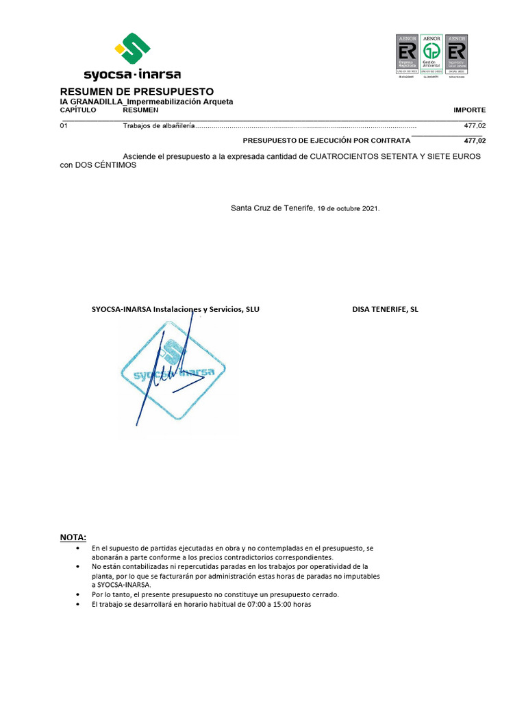 SYOCSA-INARSA_PTO_Impermeabilización Arqueta | PDF