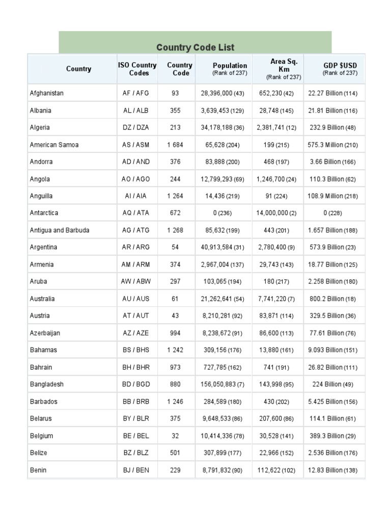Country Code List: Country ISO Country Codes Country Code Population ...