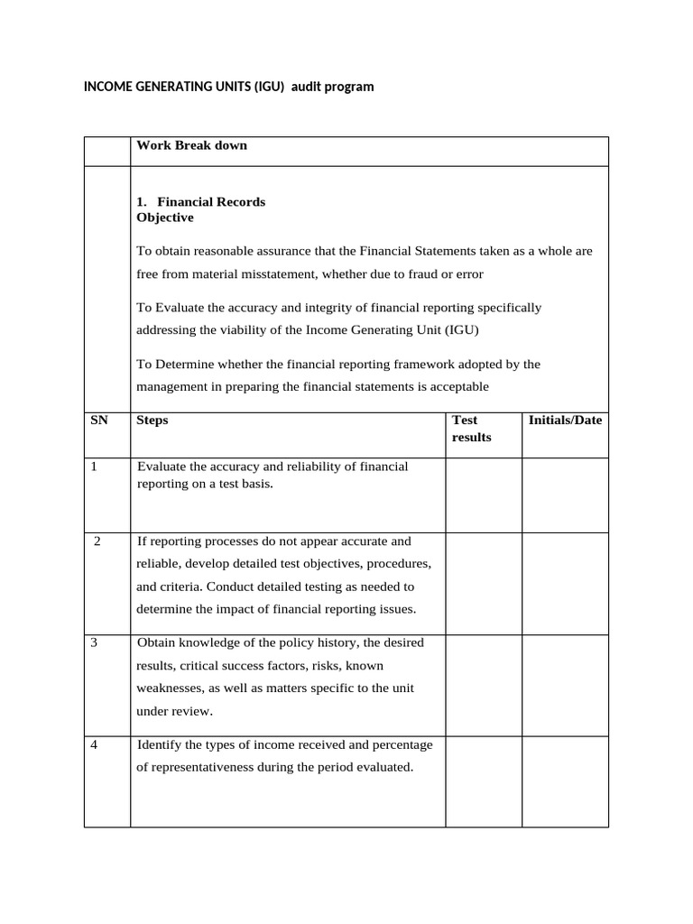 INCOME GENERATING UNITS Audit Program | PDF | Audit | Business