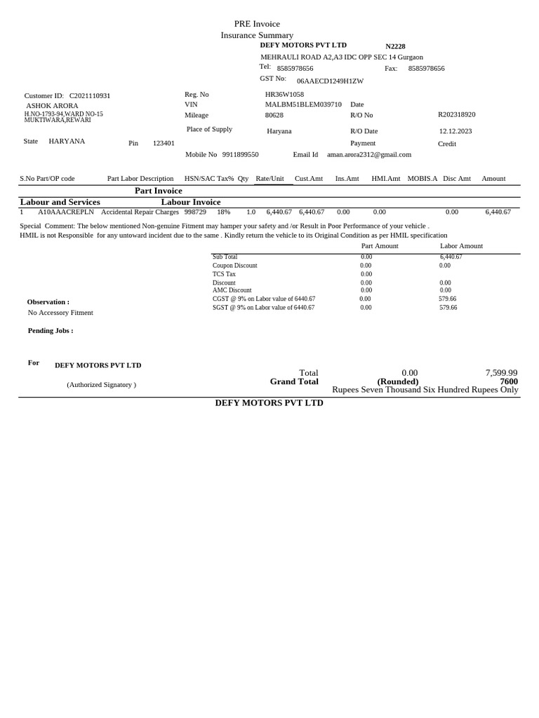 Repair Invoice | PDF