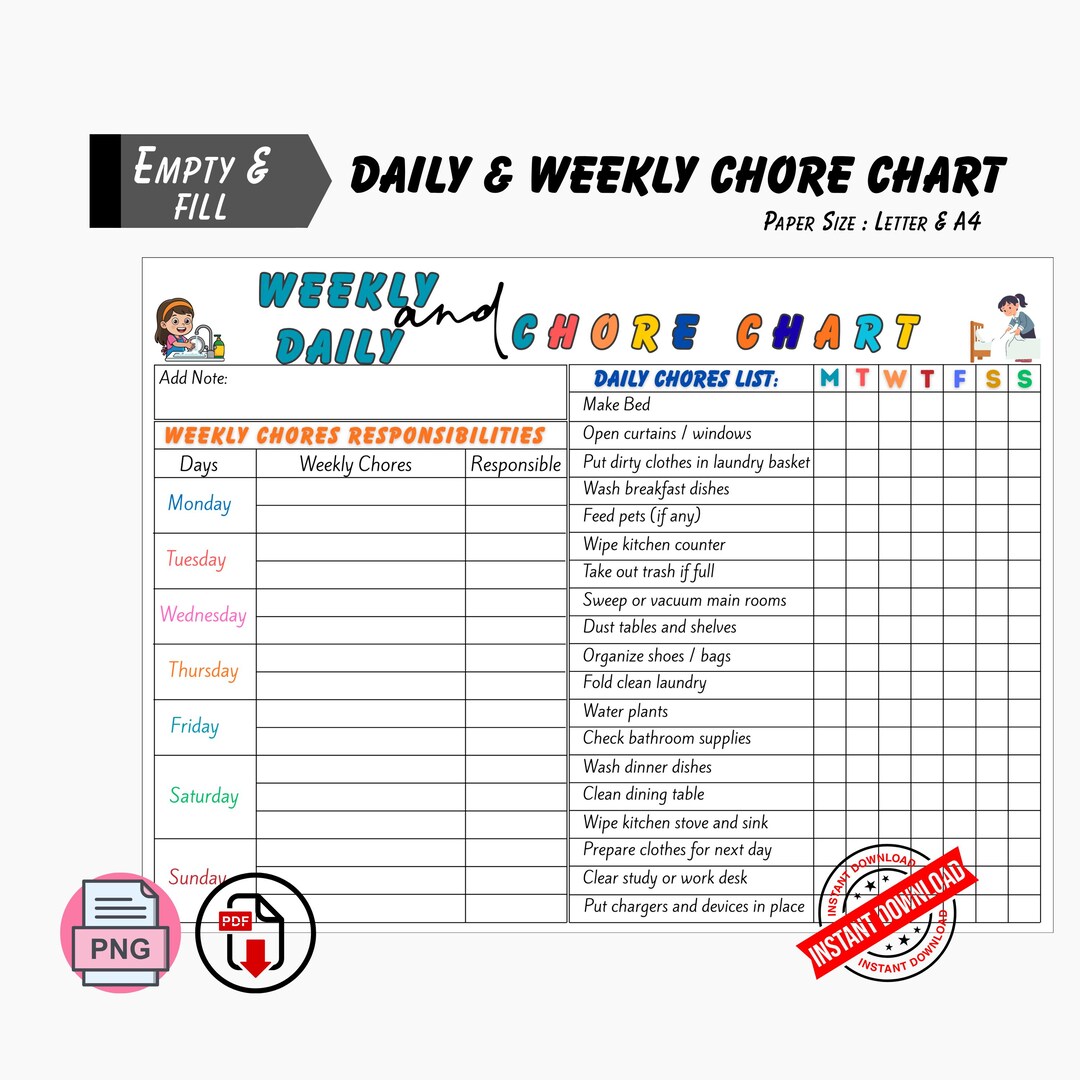 Chore Chart | Digital Printable Daily & Weekly Chore List | Family Home ...