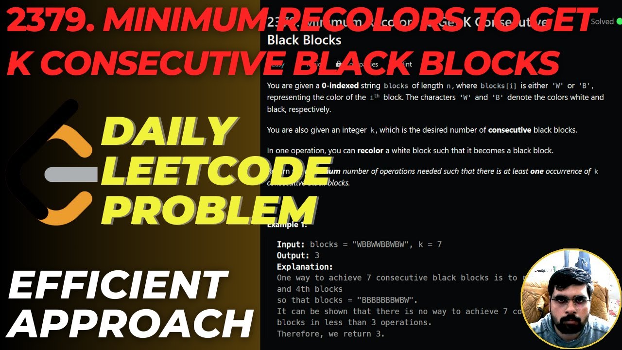 2379 Minimum Recolors to Get K Consecutive Black Blocks || leetcode ...
