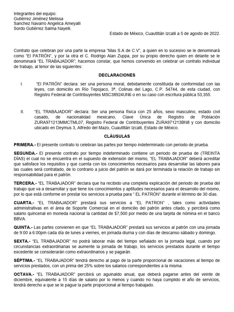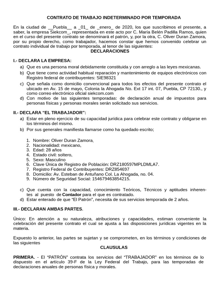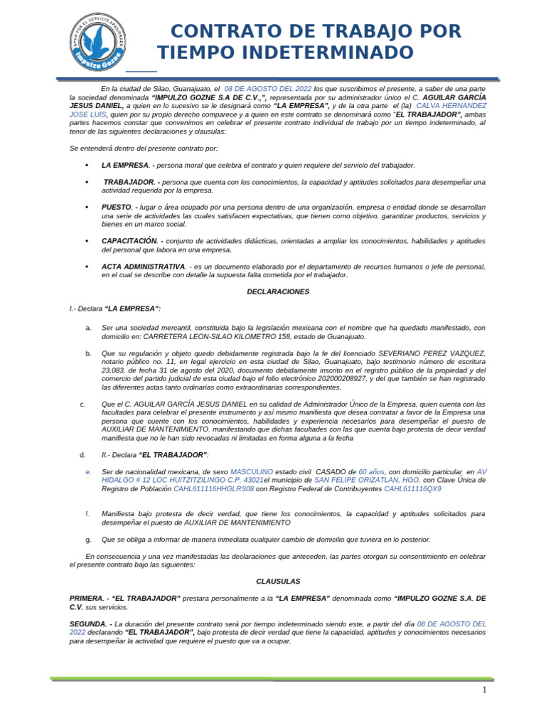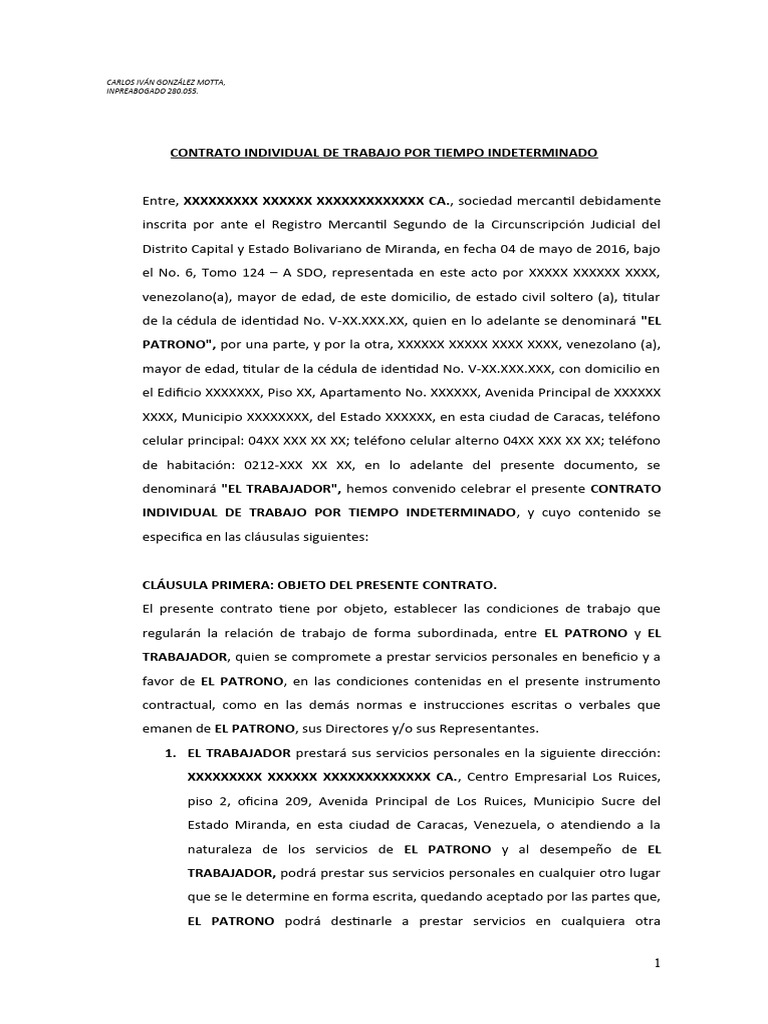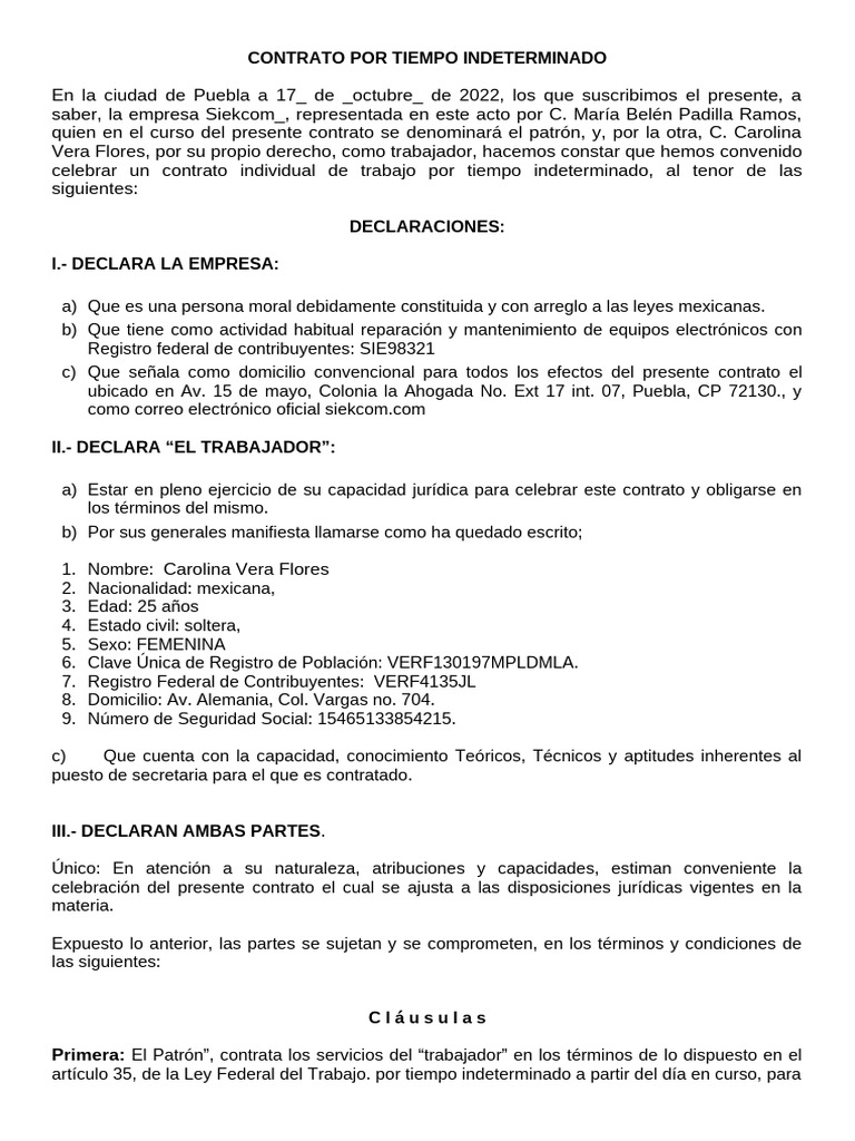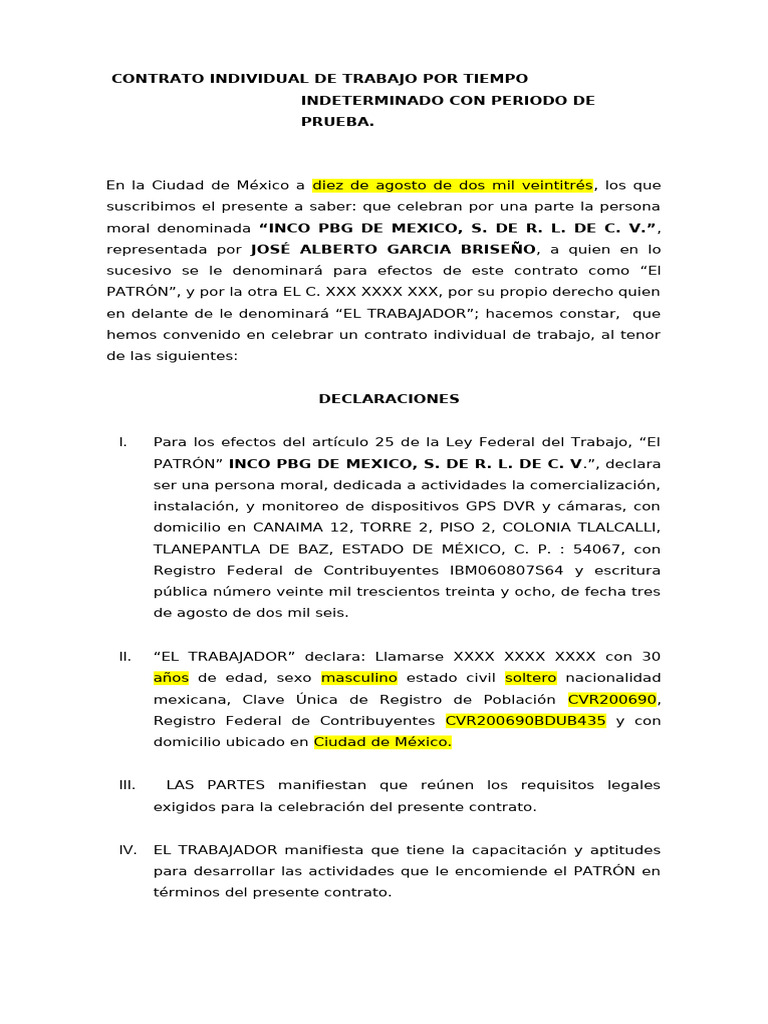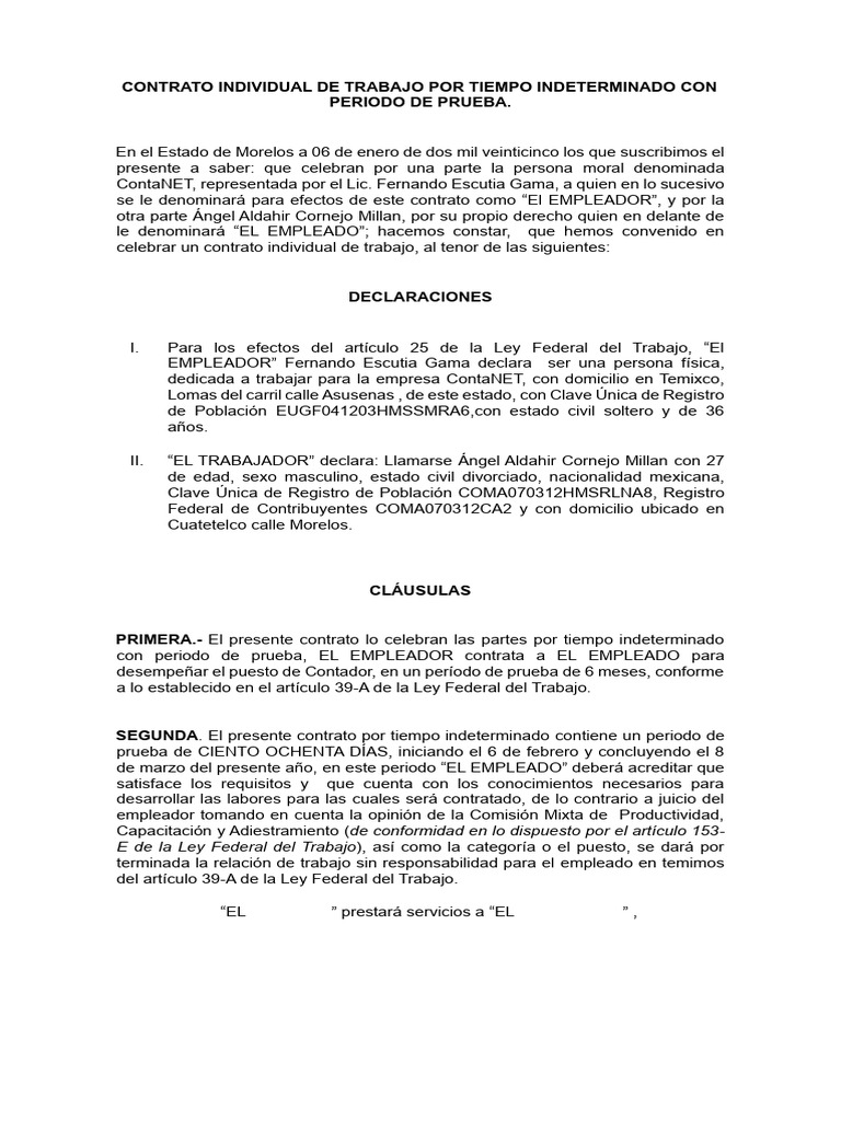 Contrato Individual de Trabajo Por Tiempo Indeterminado | PDF | Tiempo ...