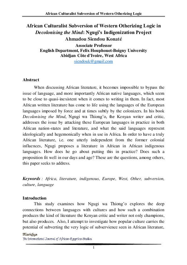 (PDF) African Culturalist Subversion of Western Otherizing Logic in ...