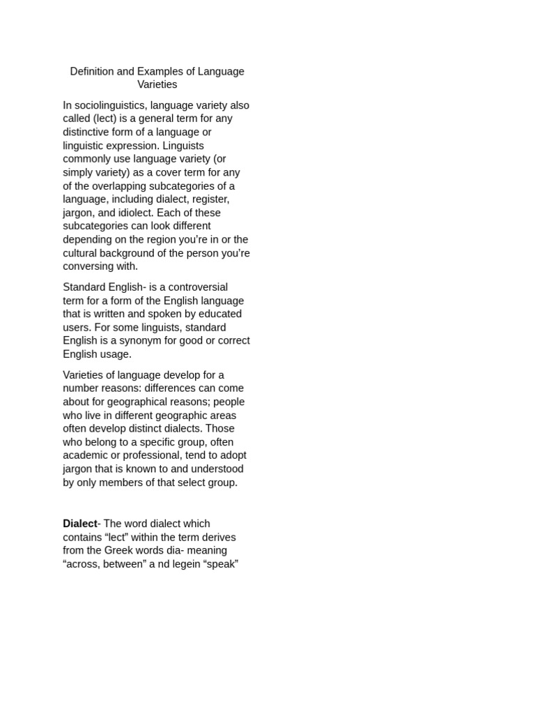 (DOC) Definition and Examples of Language Varieties These "lects" refer ...