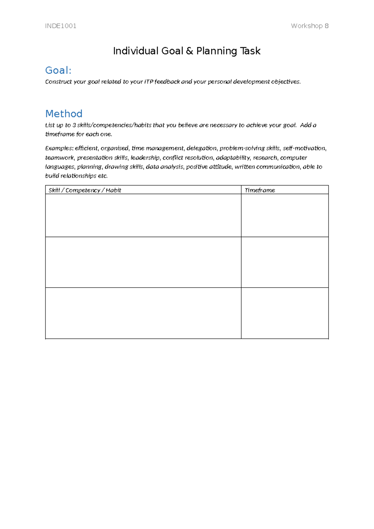 INDE1001 - Workshop 8.1 - Individual Goal - INDE1001 Workshop 8 ...