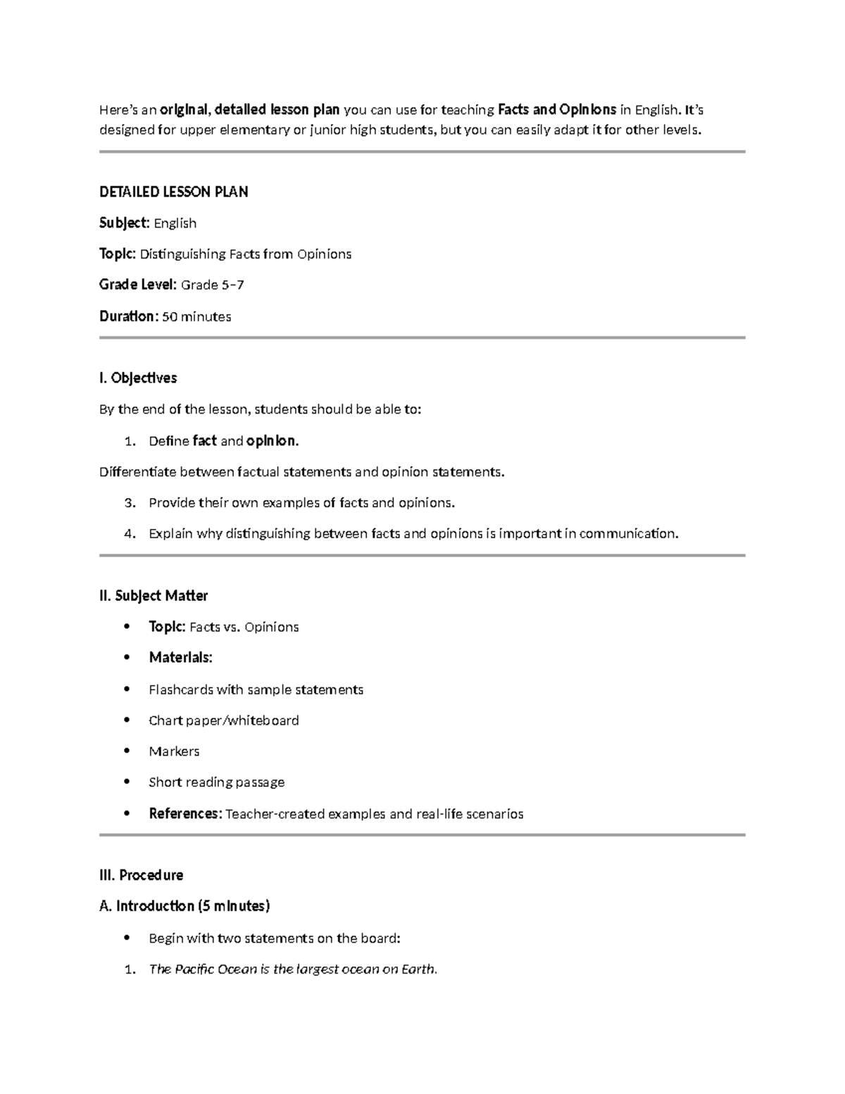 ENG 101: Detailed Lesson Plan on Facts vs. Opinions for Grades 4-8 ...