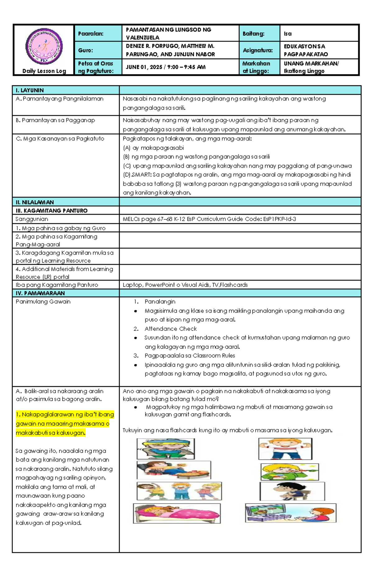 Group 9 ESP 1 Daily Lesson Log: Self-Care and Health Practices - Studocu