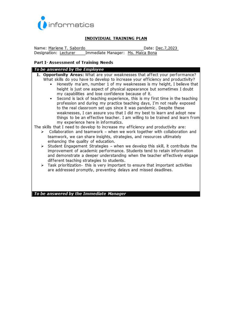 Individual Training Plan: To Be Answered by The Employee | PDF ...