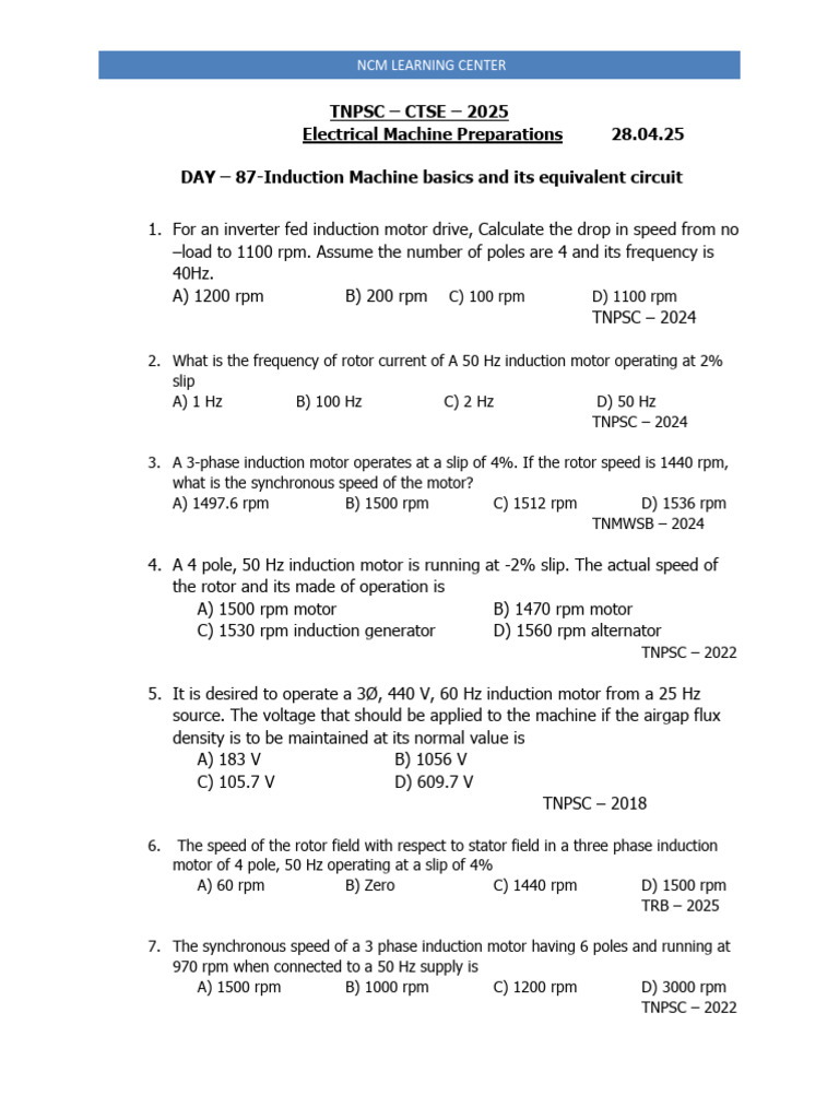 Electrical Machines Tutorial Questions On Induction Machine | PDF ...