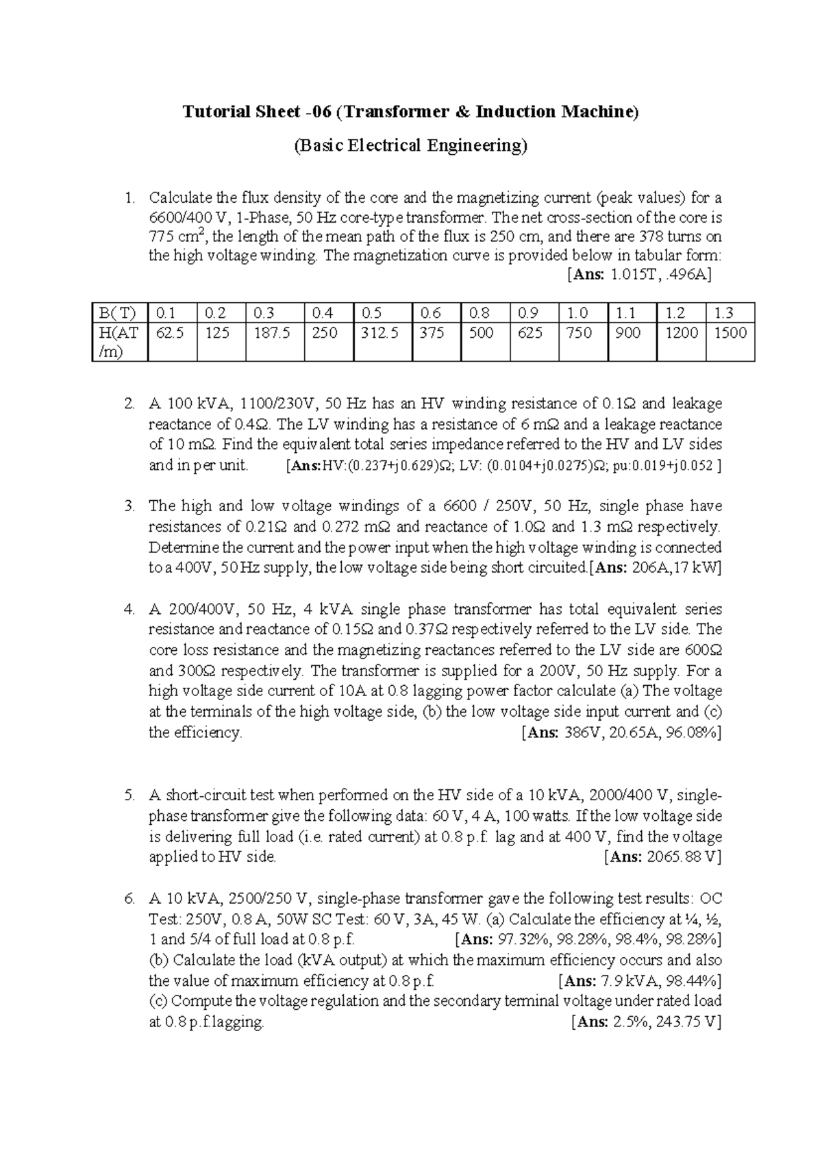 Tutorial Sheet: Transformer & Induction Machine Calculations (BEE ...