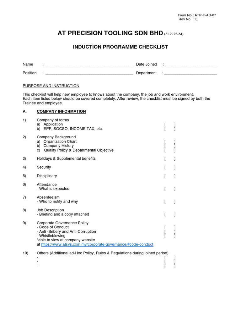 Employee Induction Checklist - Cleaned | PDF | Employment ...