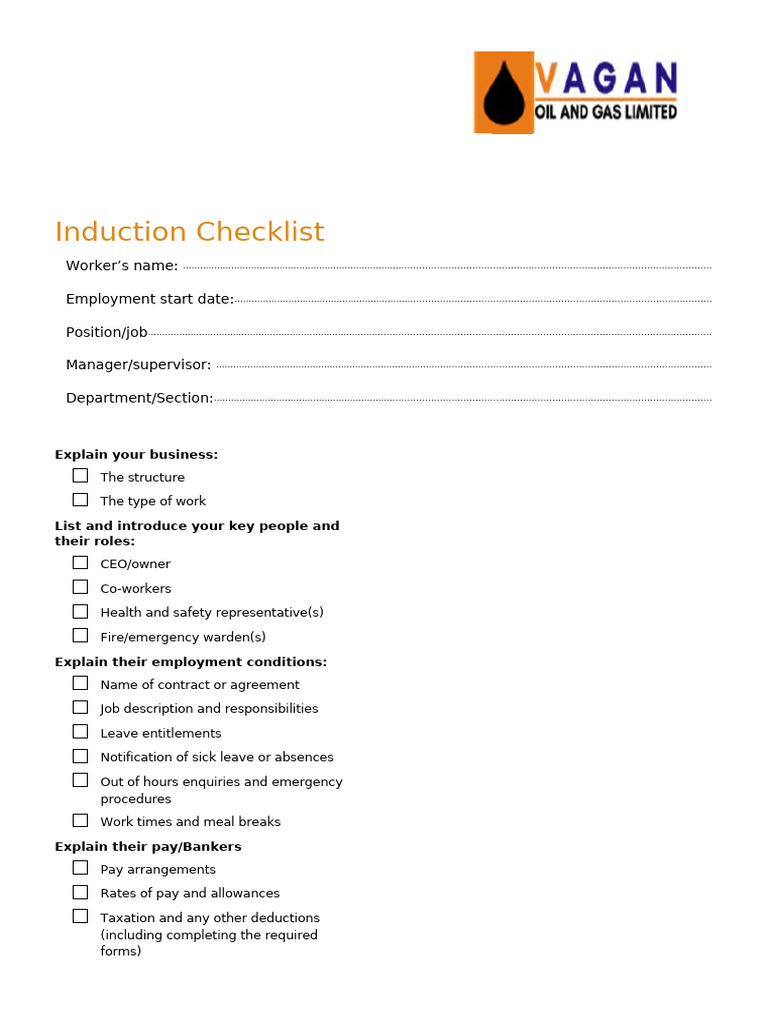 Induction Checklist | Occupational Safety And Health | Employee Relations