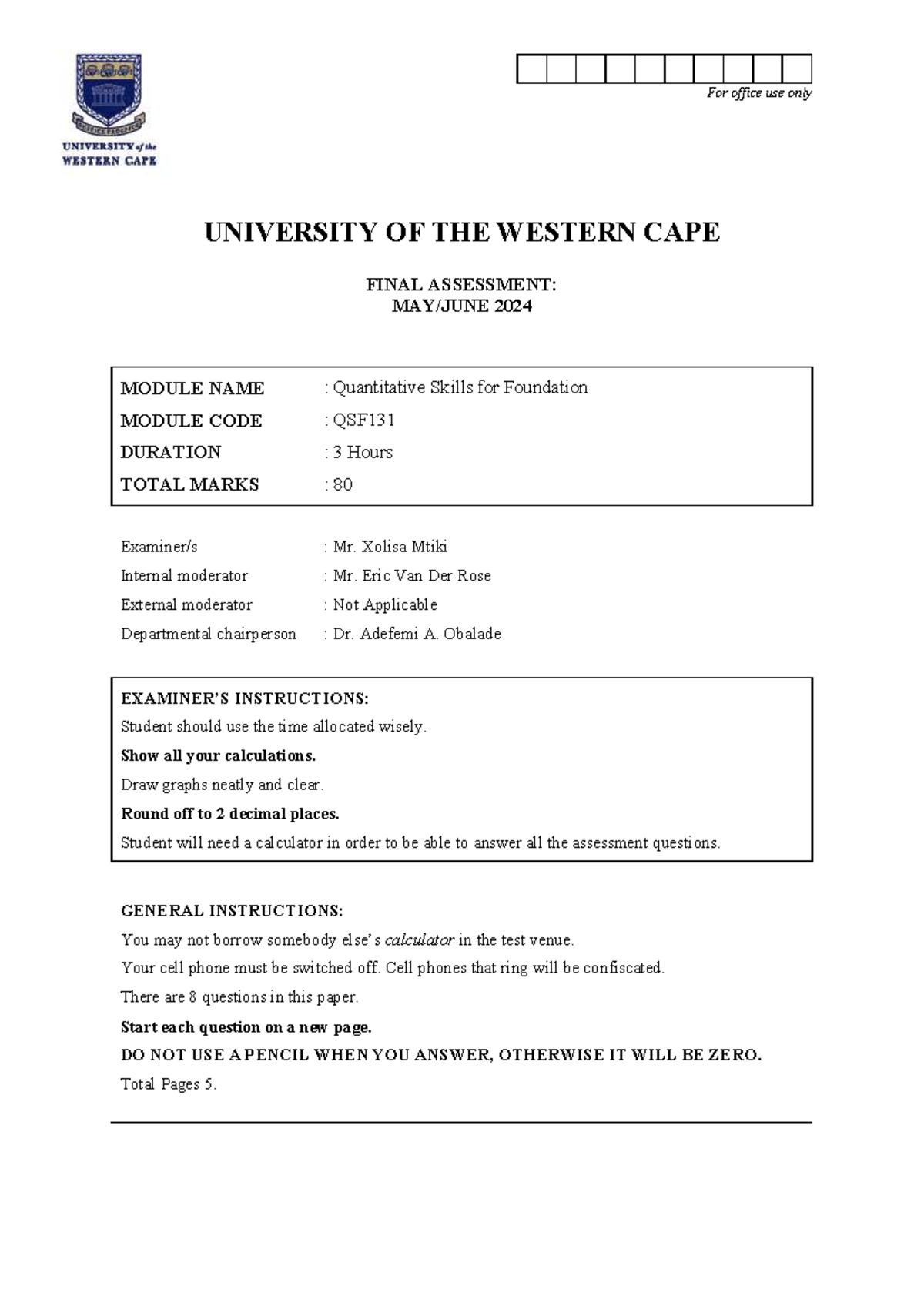QSF131 2024 Final Assessment: Quantitative Skills Practice Test - Studocu