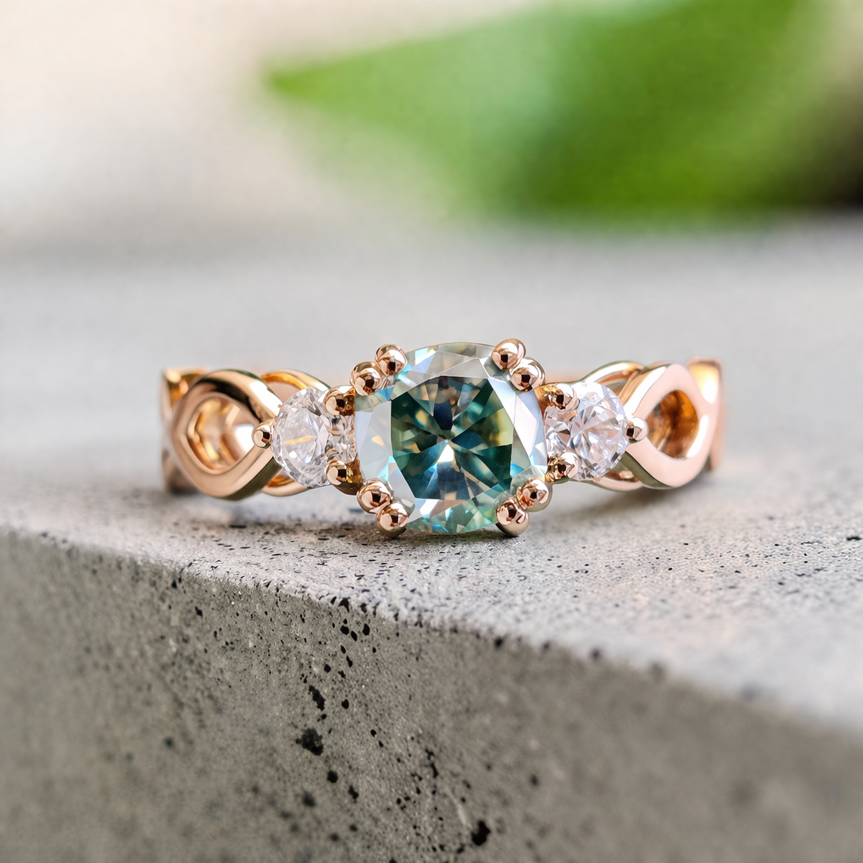 Elegant Green Moissanite Three-Stone Ring with Infinity Band – A Timel