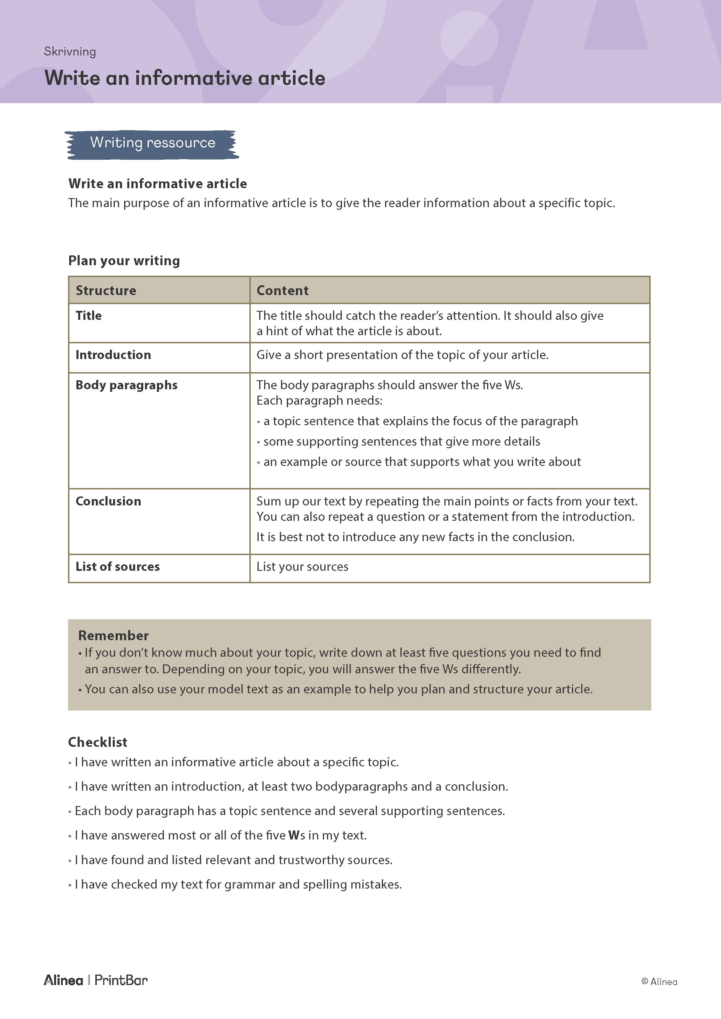 Write an informative article | Gratis engelskopgave til print til 7. 8 ...