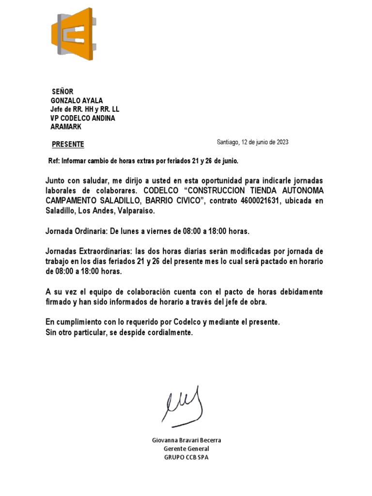 Carta Informando Horarios Colaboradores | PDF