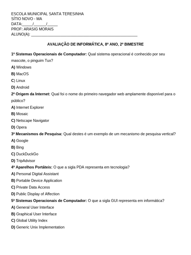 Avaliação de Informatica 8 Ano 2 Bimestre | PDF | Tecnologia e Engenharia