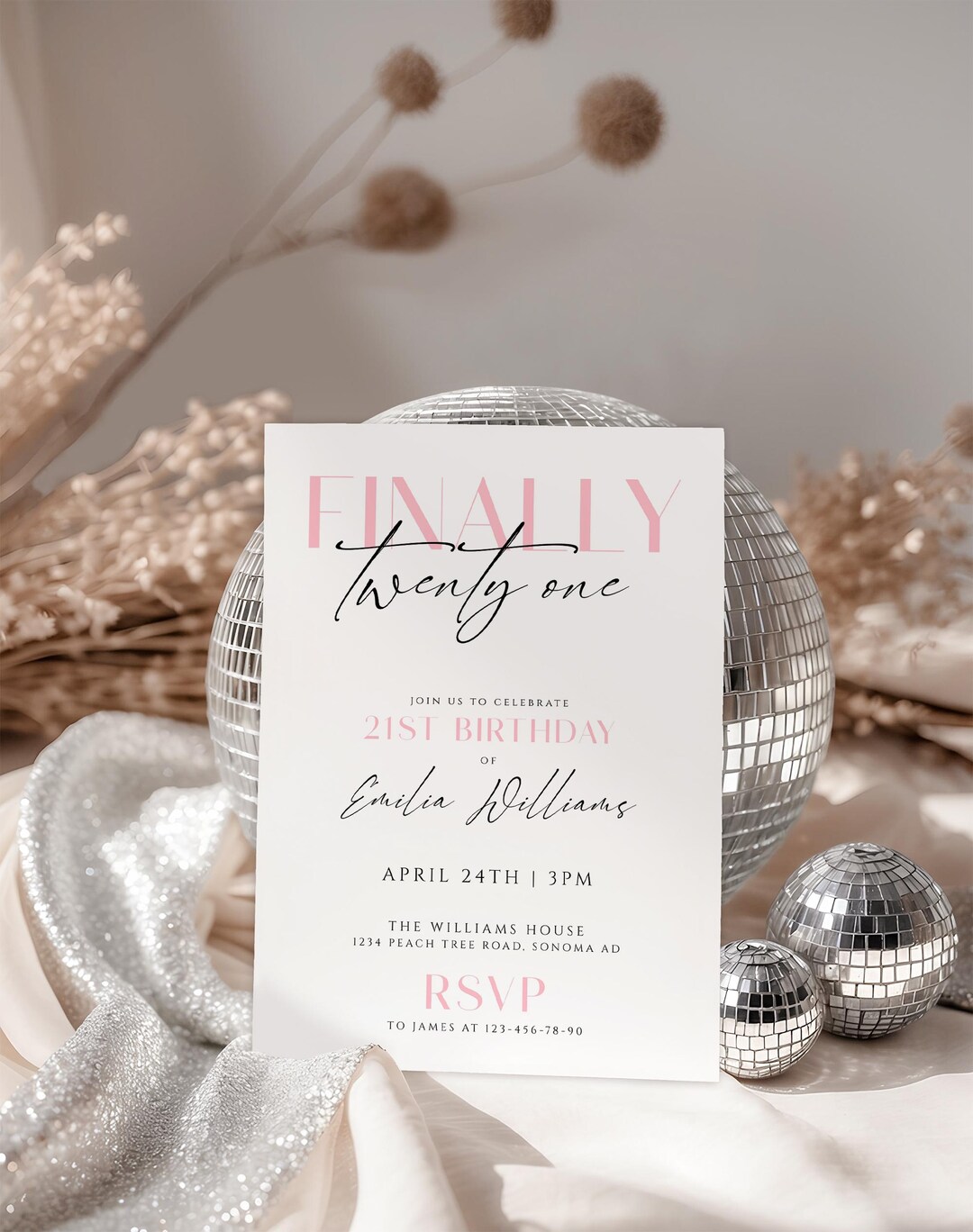 Black & Pink 21st Bday Invitation, Finally Twenty One Adult Minimalist ...