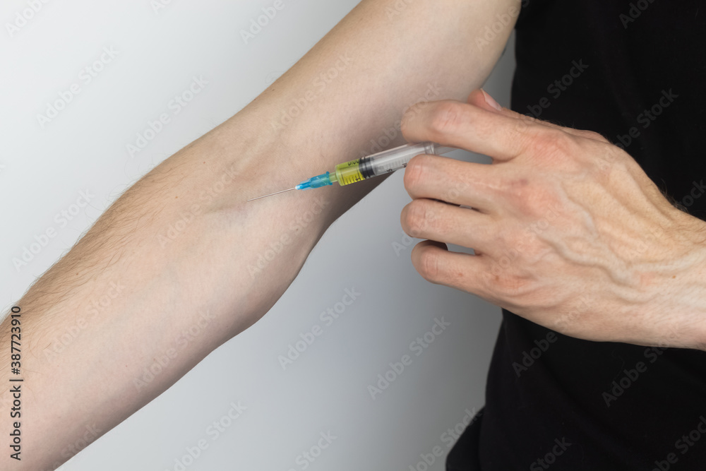 Man has an injection into a vein. Drug addiction concept | Colourbox