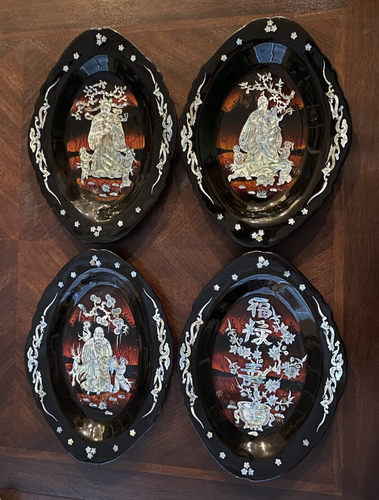 Set of 4 Inlaid Mother of Pearl Black Lacquerware Oriental Shell Art ...