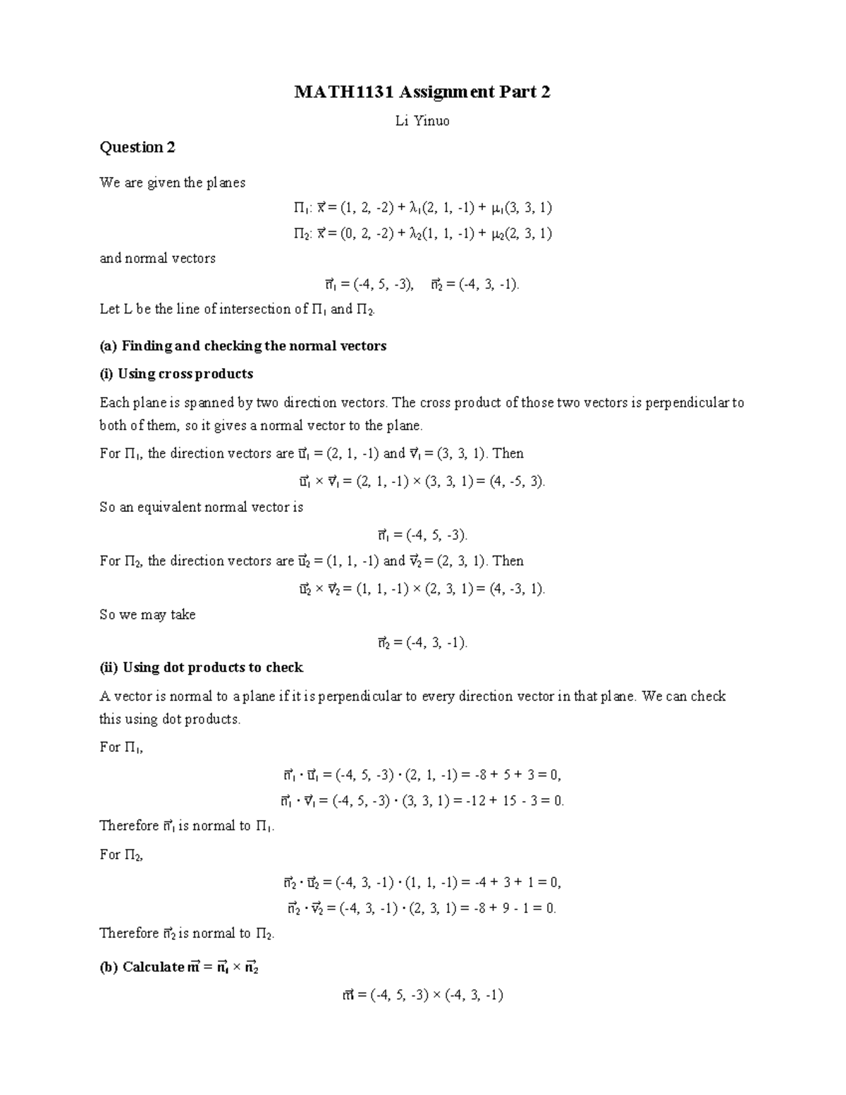 MATH1131 Assignment Part 2: Intersection of Planes and Normal Vectors ...