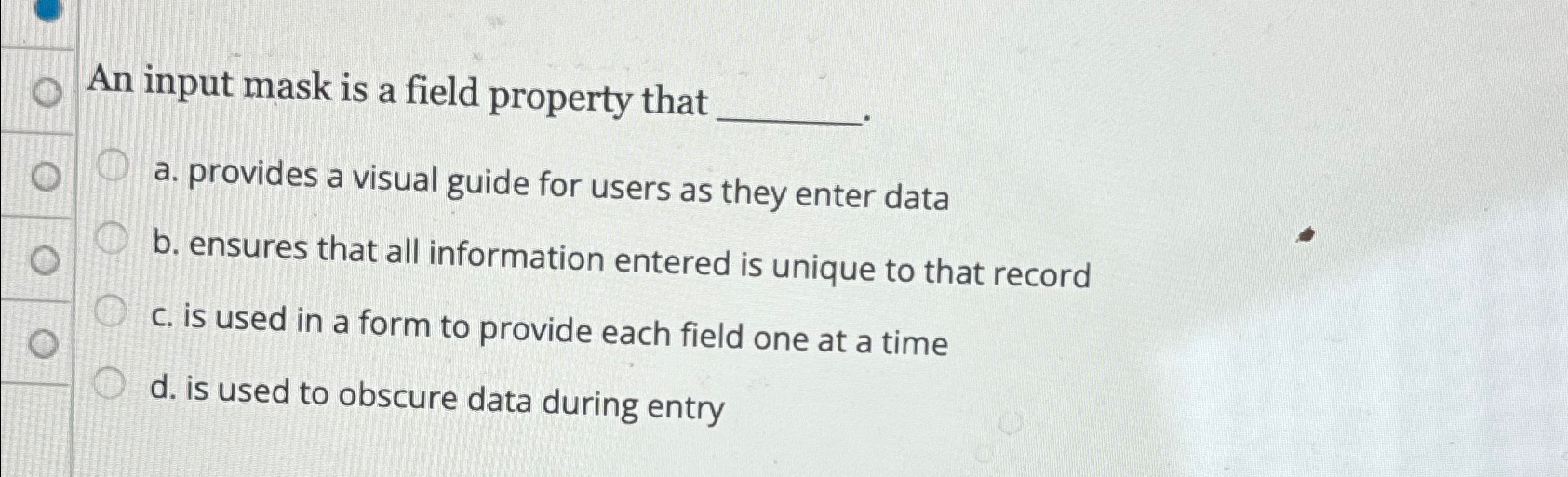 Solved An input mask is a field property thata. provides a | Chegg.com