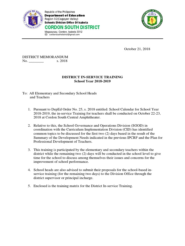 District In-Service Training Matrix for Cordon South District Teachers ...