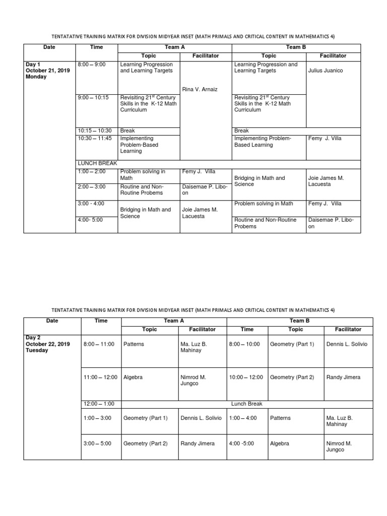 Training Matrix Mid Inset 2019 | PDF | Teaching | Teaching Mathematics