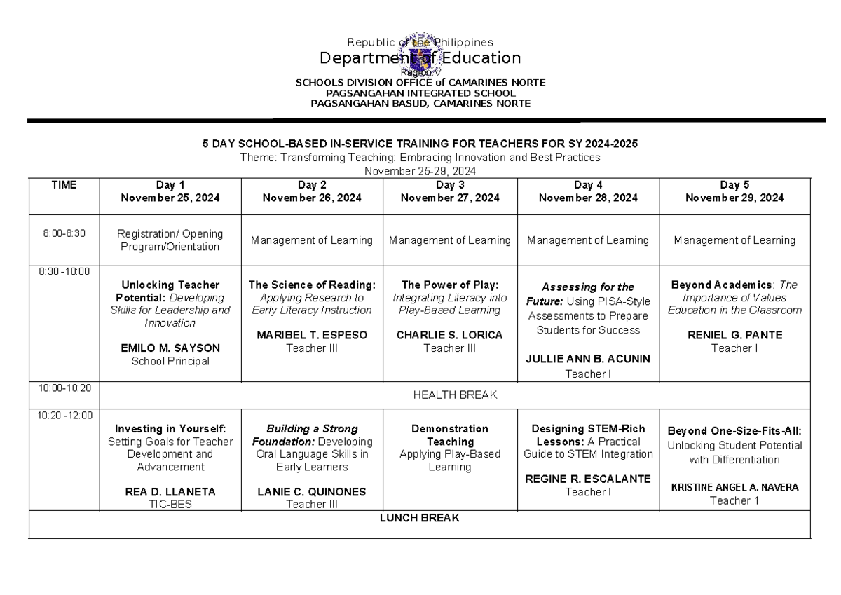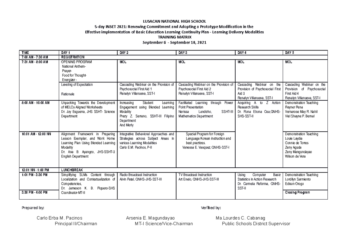 Training Matrix for 5-Day INSET 2021 at Lusacan National High School ...