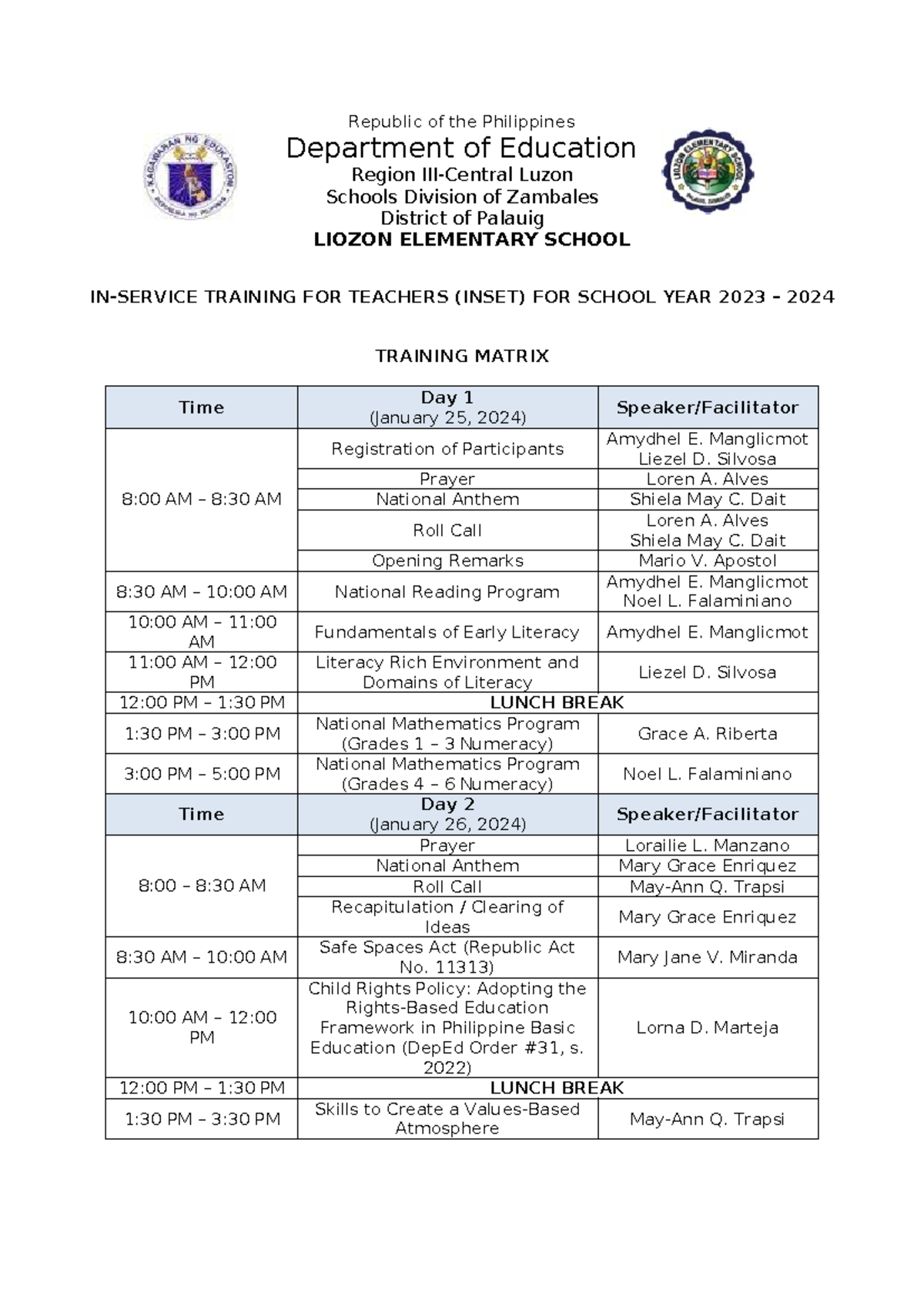 LIOZON ELEMENTARY SCHOOL INSET Training Matrix SY 2023-2024 - Studocu