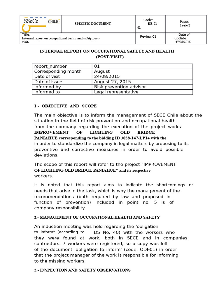 Internal Report On Occupational Health and Safety Post-Visit | PDF ...