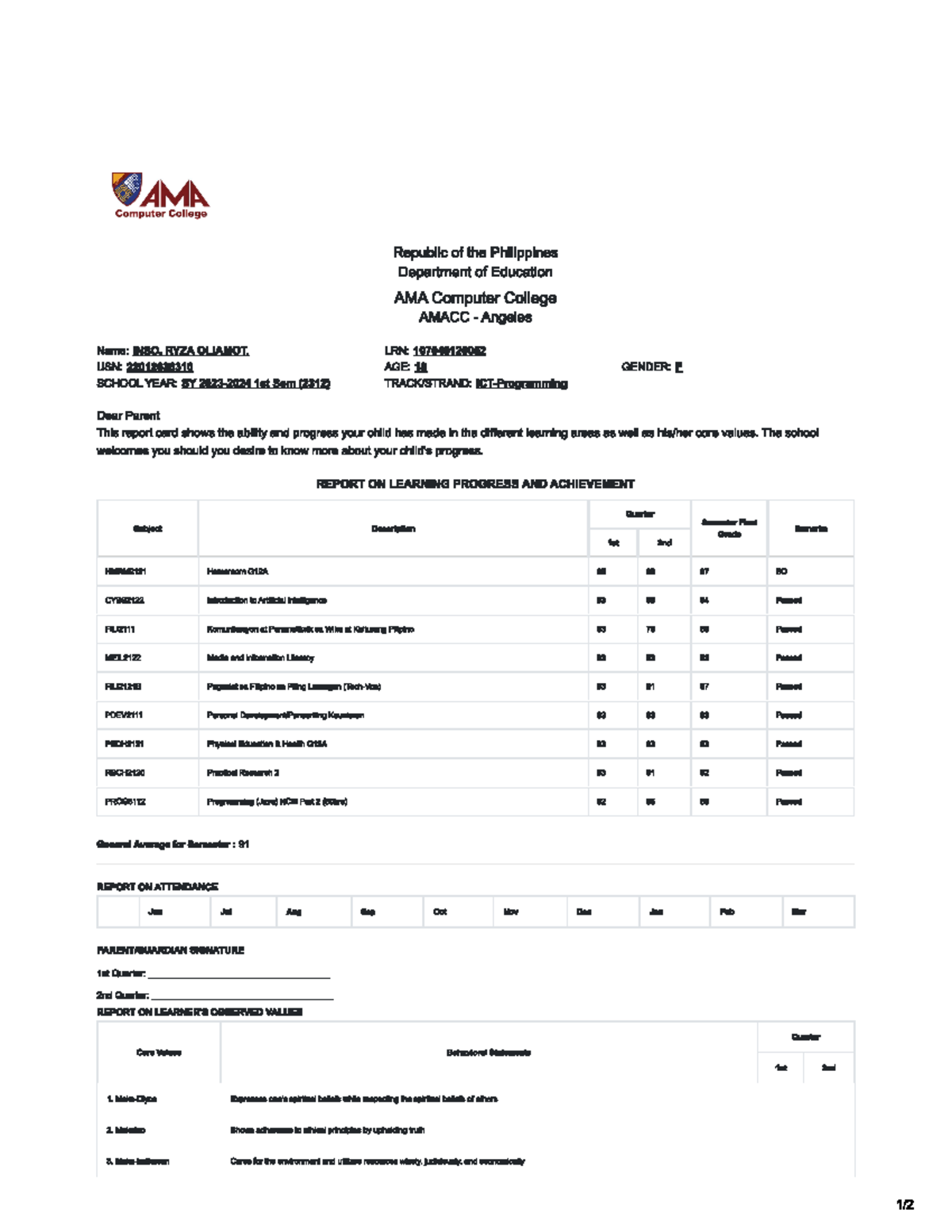 Report Card Summary SY 1st Sem (2312) - INSO, RYZA OLIAMOT - Studocu