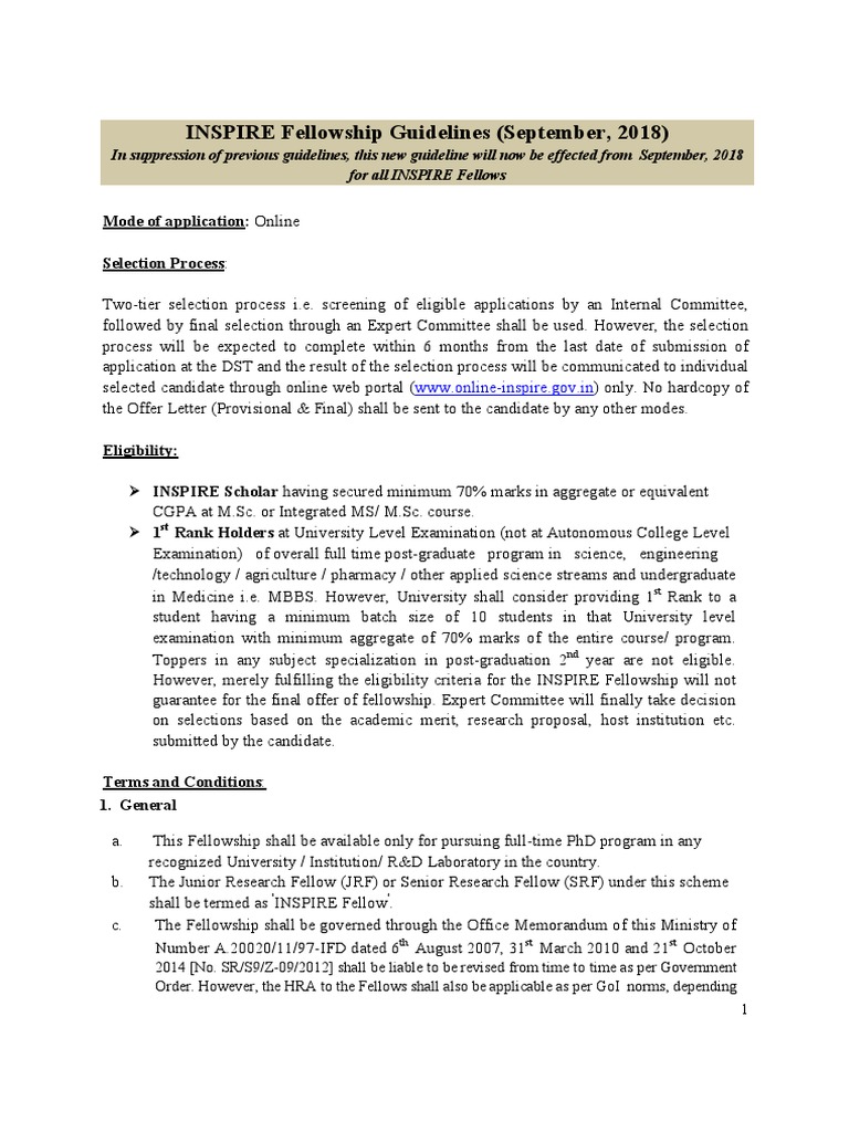 INSPIRE Fellowship Guidelines September 2018 PDF | PDF | Doctor Of ...