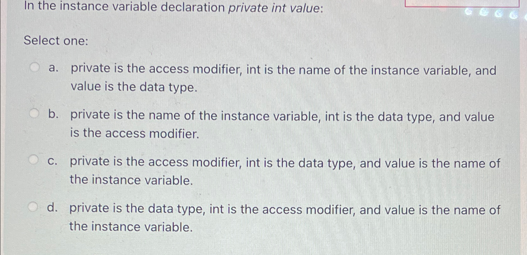 Solved In the instance variable declaration private int | Chegg.com