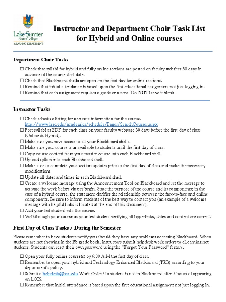 Course Start Instructor Task Lists Checklist Blackboard Updated 04-17 ...