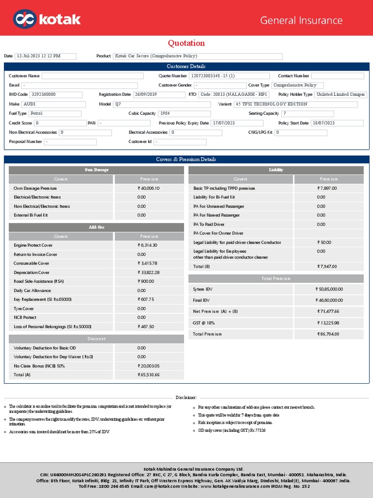 Car Insurance Quotation - Fill Online, Printable, Fillable, Blank ...