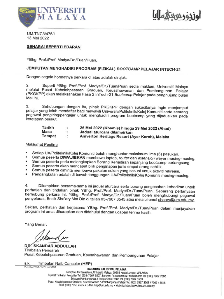 Jemputan Menghadiri Program Fizikal Bootcamp Pelajar Intech 21 | PDF
