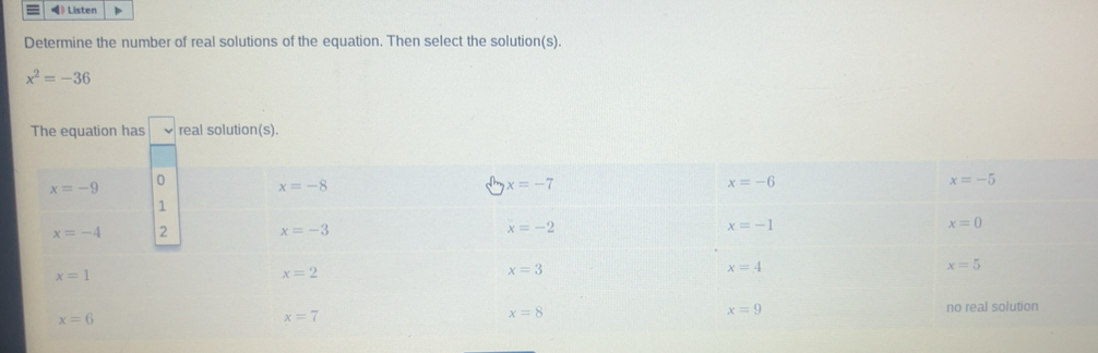 Solved: 》 Listen Determine the number of real solutions of the equation ...