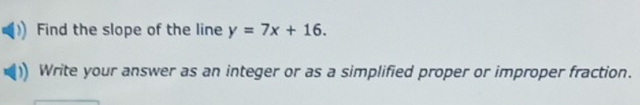 Solved: Find the slope of the line y=7x+16. Write your answer as an ...