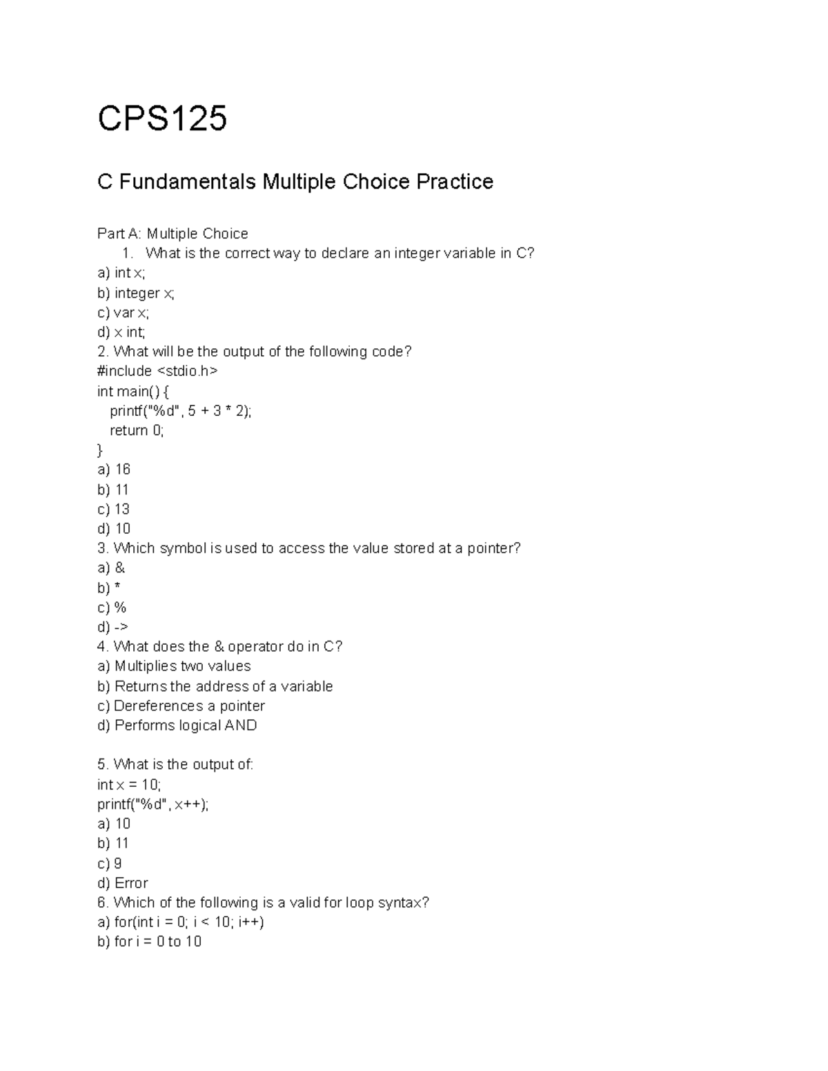 CPS125 C Fundamentals MCQ Practice Part A: Multiple Choice Questions ...