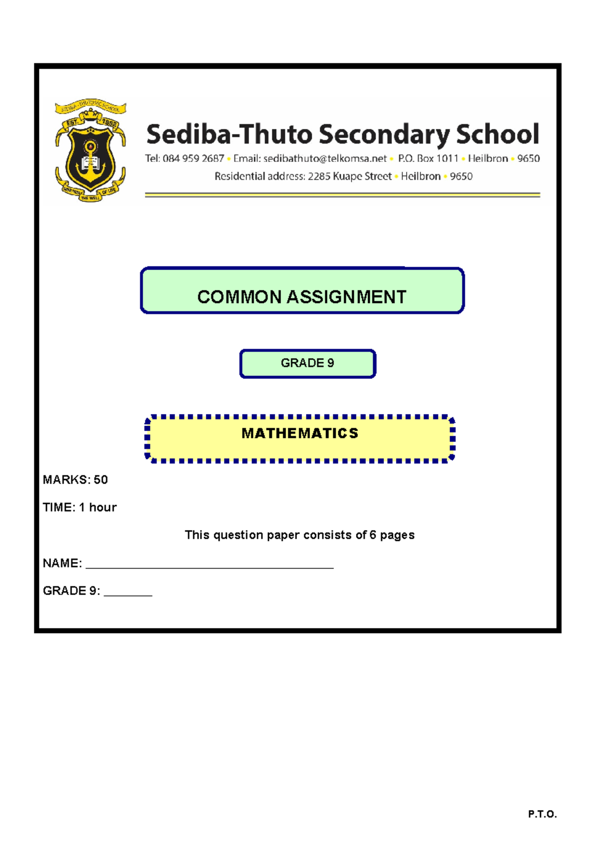 Grade 9 Mathematics Common Assignment 2015 - Marks: 50 - Studocu