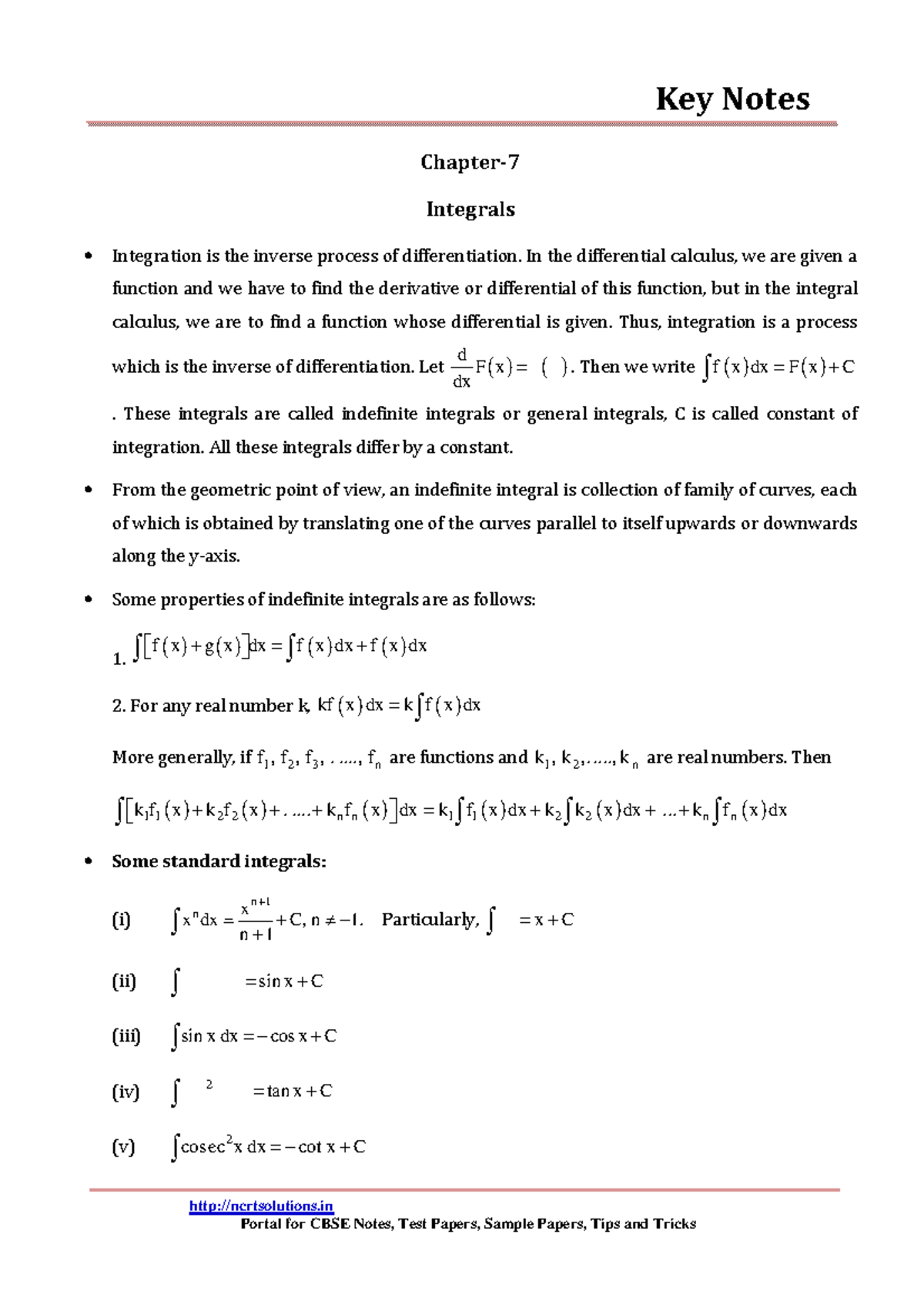 Key Notes on Integrals - Chapter 07 (MATH 12) - Studocu