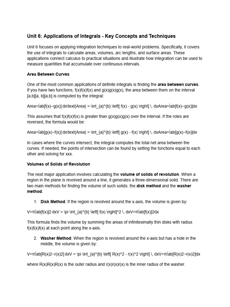 Unit 6 - Applications of Integrals - Key Concepts and Techniques | PDF ...