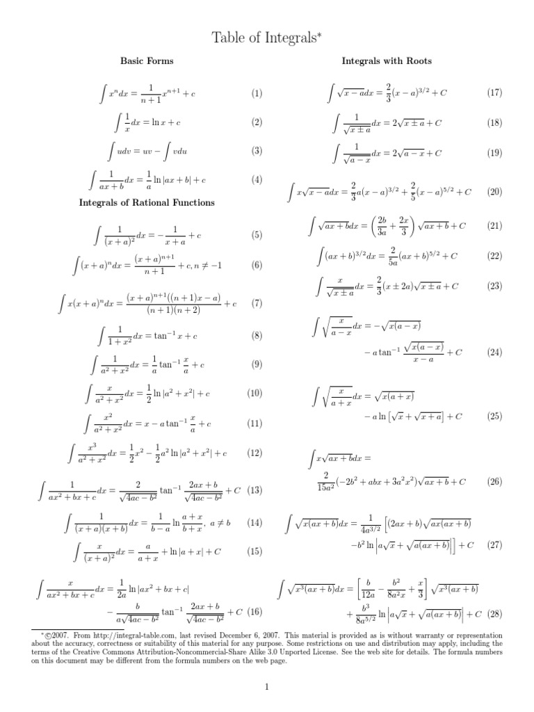 Table of Integrals: Basic Forms Integrals With Roots | PDF ...