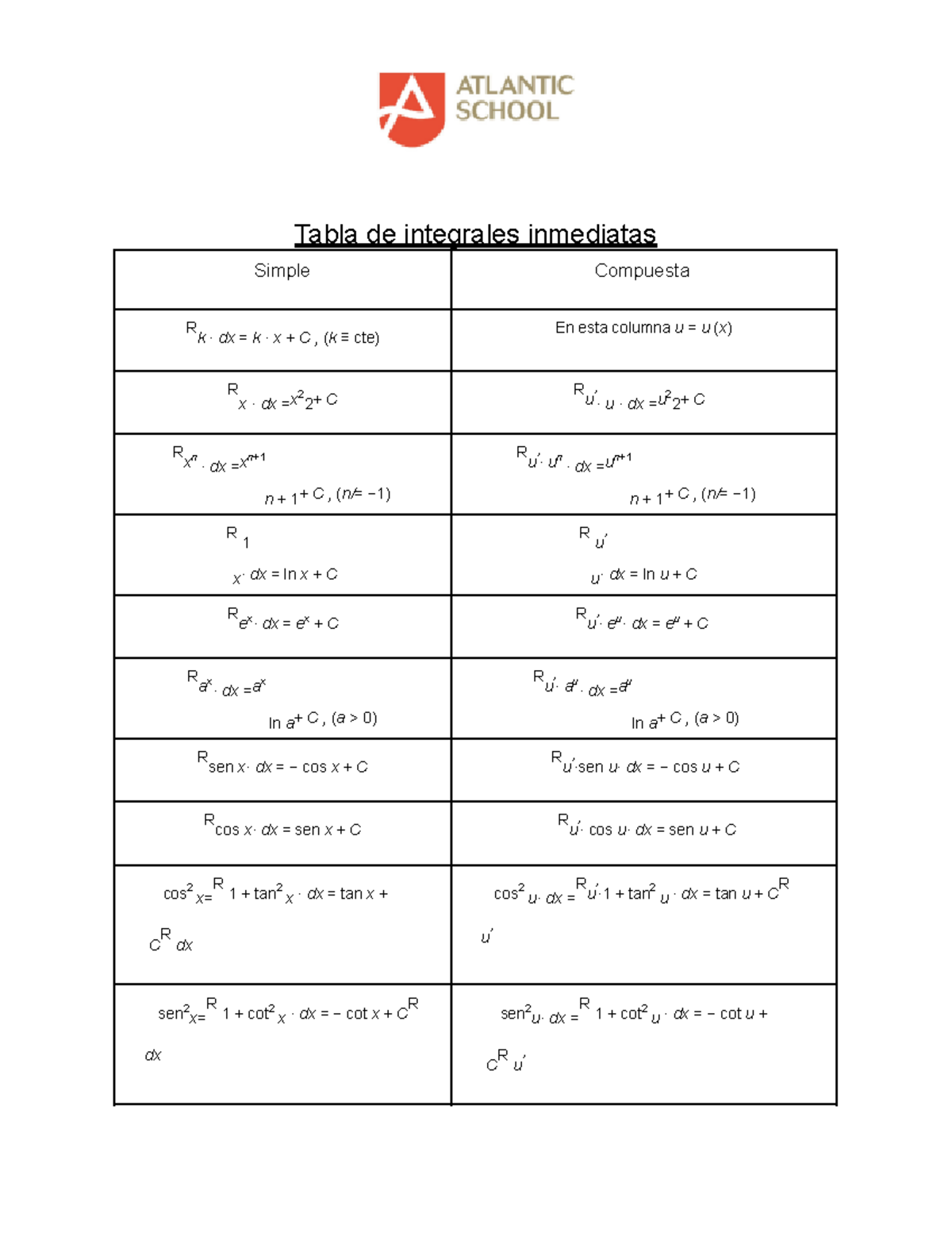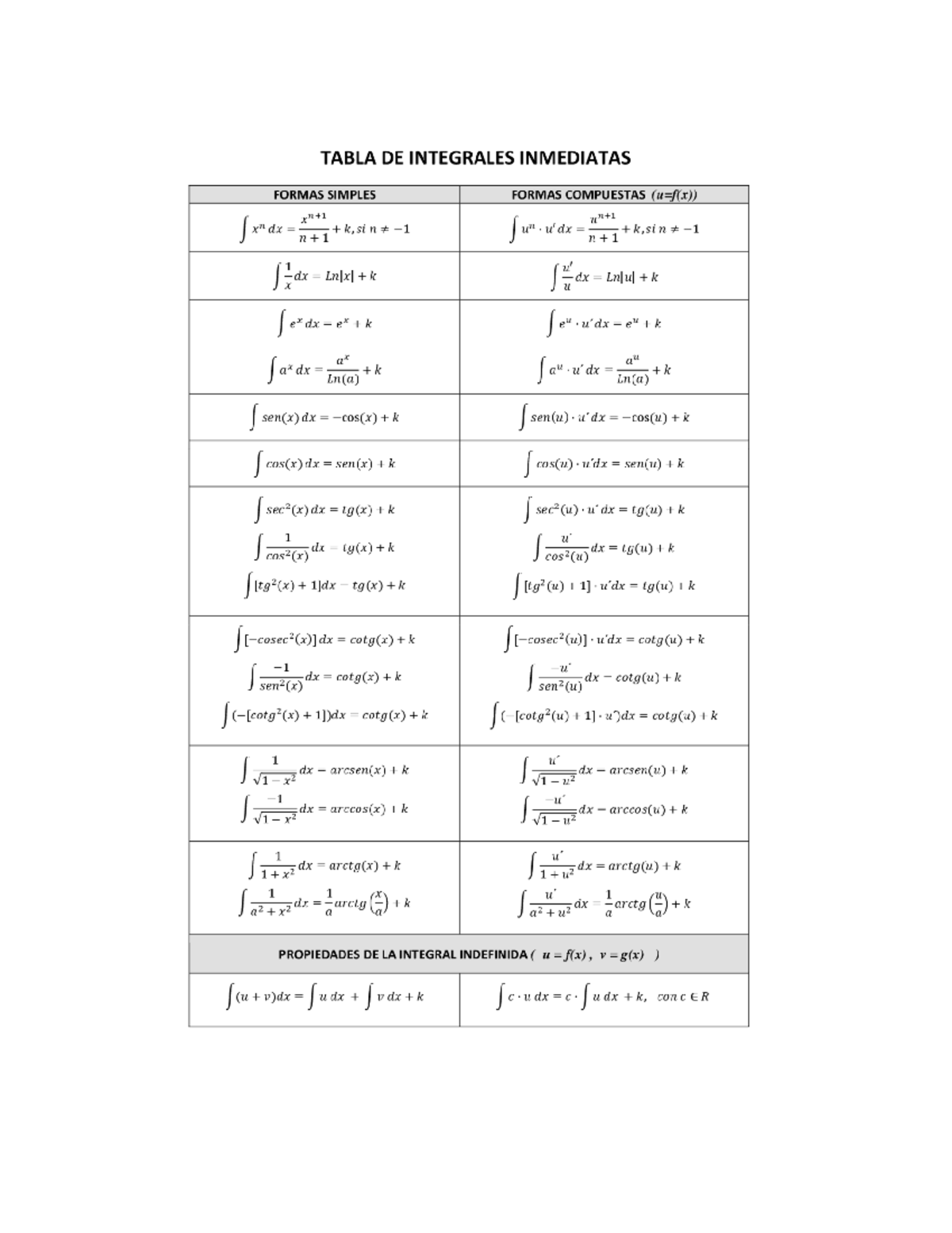Tabla de Integrales Inmediatas - Funciones Simples y Compuestas - Studocu