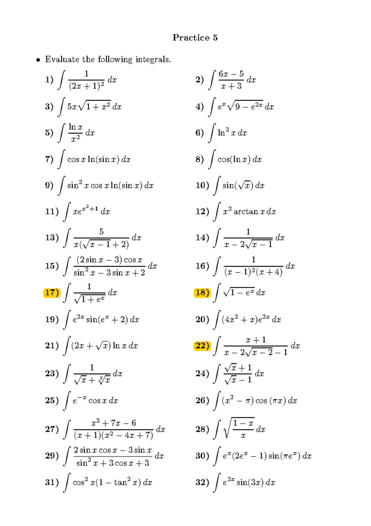 Sample Practice 5 - Practice 5 • Evaluate the following integrals. Z 1 ...